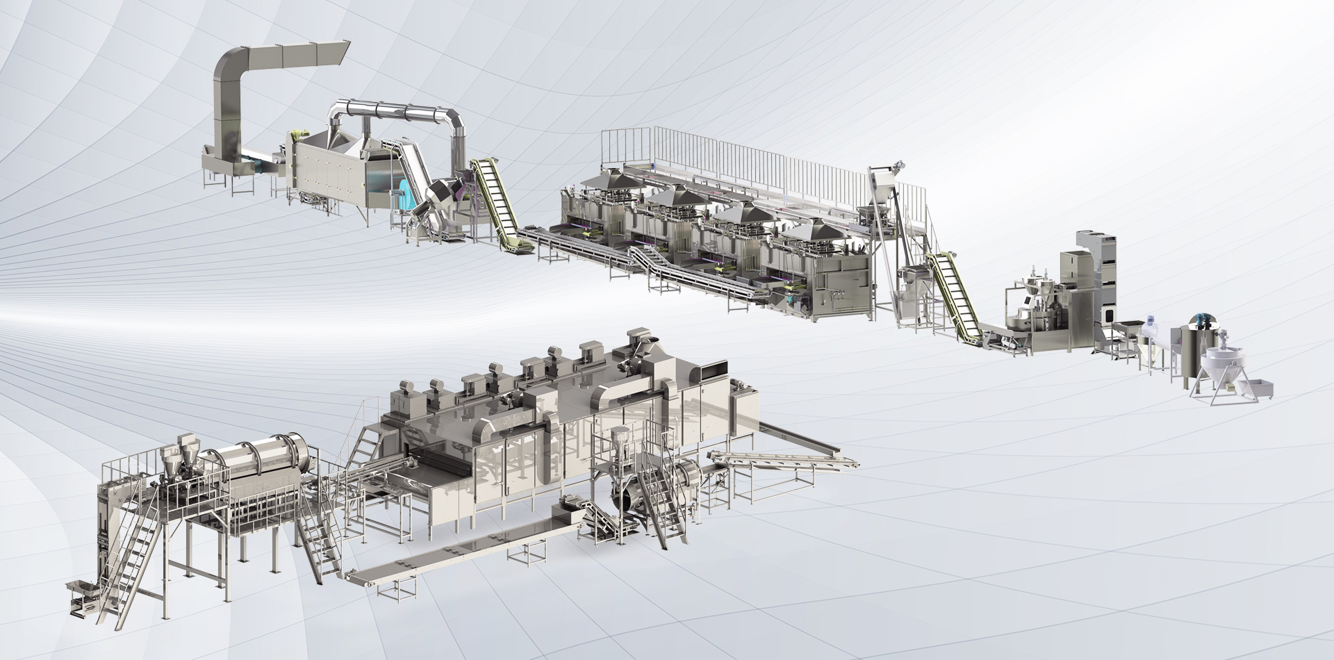 該生產(chǎn)線廣泛用于堅(jiān)果、籽類(lèi)、裹粉顆粒食品、薯片、薯?xiàng)l、膨化食品等加工生產(chǎn)。
